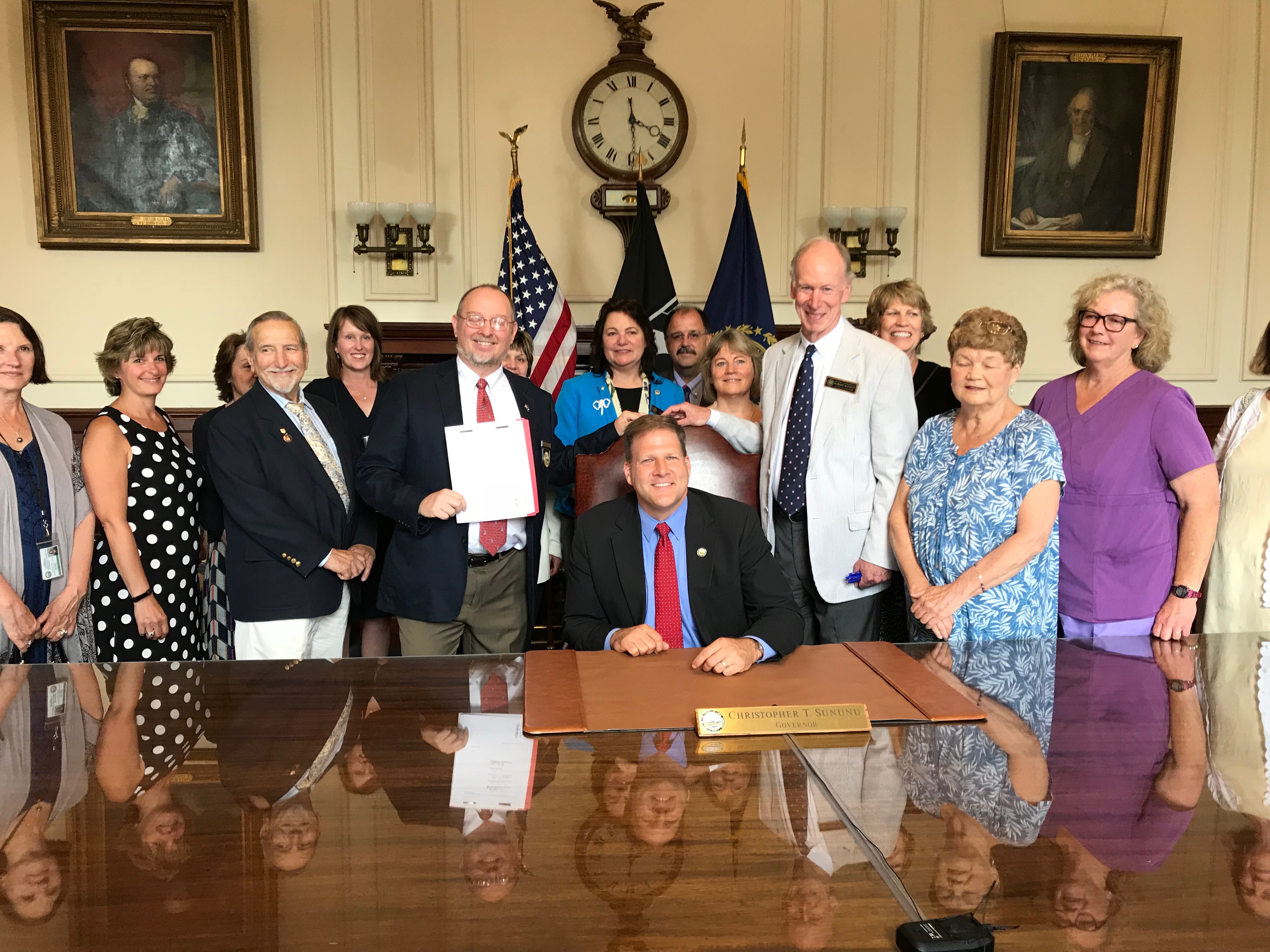 Pictured here at the signing are, from left to right, front row: Denies Nies (BON), Samantha O'Neil (BON), Rep Kevin Scully, Governor Chris Sununu, Rep Howard Moffett, Sandi Pascucci. Back row: Pam DiNapoli (NHNA), Jennifer Thompson (NHNPA), Rep Anne Copp, Rep Don Gorman, Joan Widmer (NHNA), Rep Polly Campion.